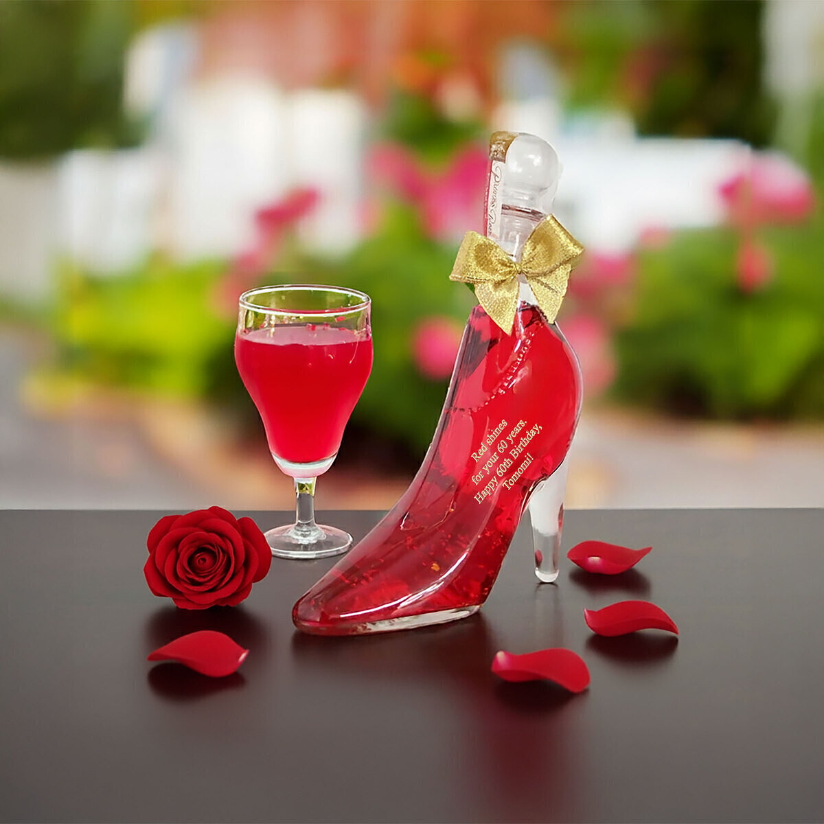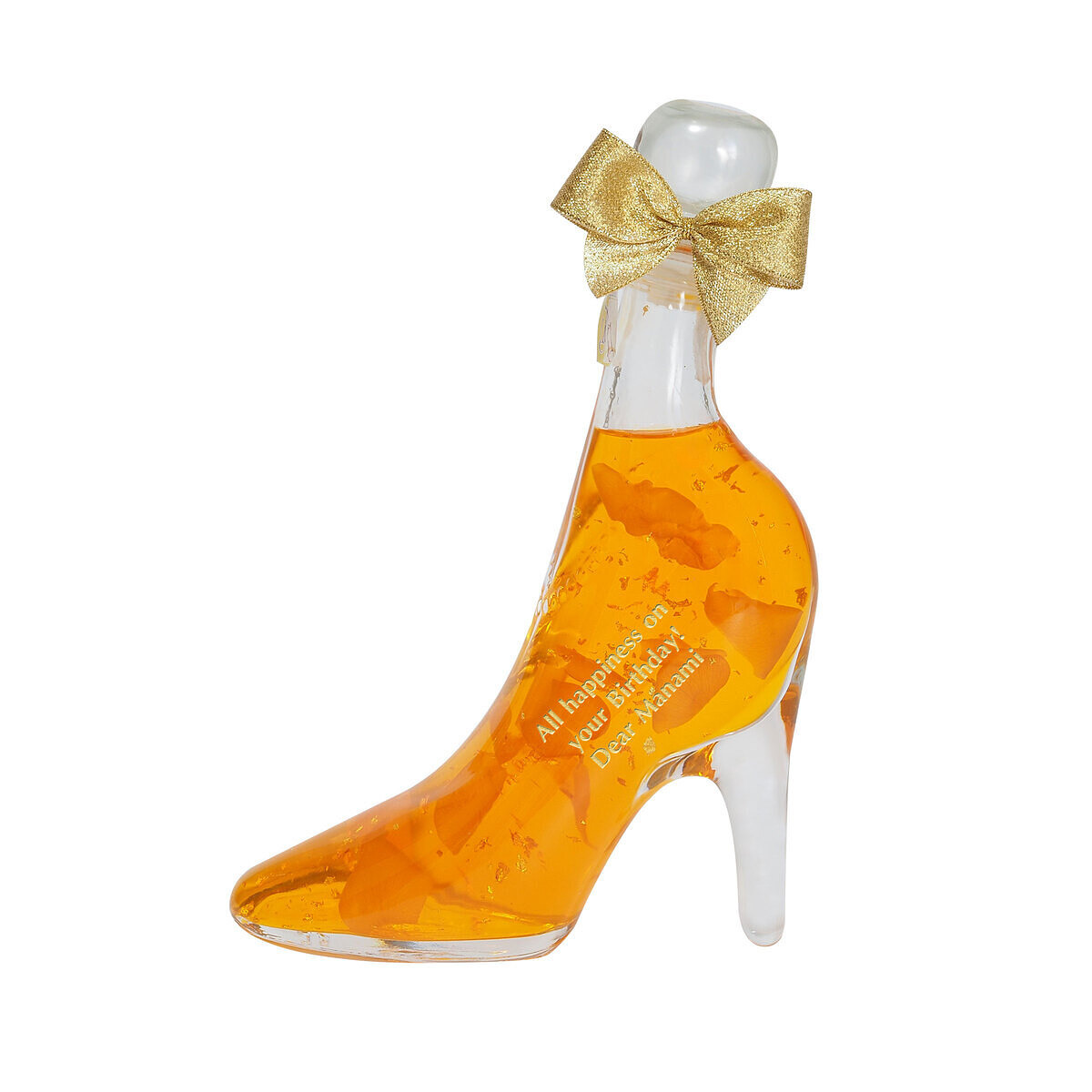 創業50余年のお花の会社で生まれた、華やかなでゴージャスなリキュール。ハイヒールを模したボトルに閉じ込められたリキュールのなかで、本物の花びらと金箔が幻想的に舞います。リキュールにはほのかにゼリーの食感がつけられていて、花びらや金箔が沈み込まずに美しいままディスプレイできます。